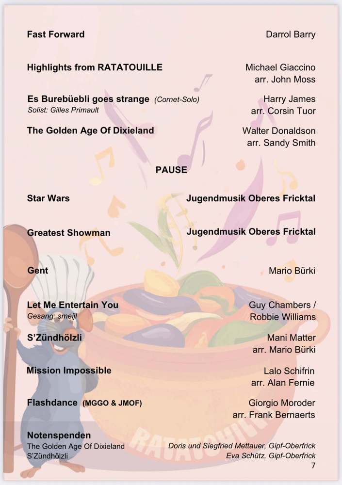 Die Singer-Songwriterinnen Svenja und Melina von «smeijl» führten charmant durch den Abend. Nach einer grossartigen Gesangseinlage ihrerseits an unserer Bar entdeckten sie «Matthias Hohlers Jukebox». Sie warfen eine Münze ein und schon erklang «Polo’s Best» arrangiert vonKlaus Butterstein mit den bekannten Melodien von Polo Hofer’s«Alperose, Wyssebühl und Kiosk». Als nächstes spielte die MGGO-Jukebox «Sing, Sing, Sing» von Louis Prima (arr. Dan Price) unter Mitwirkung der Tambouren Wittnau. Diese sorgten anschliessend mit ihren rhythmischen Darbietungen und Showeinlagen für mächtig Wirbel. Etwas mystisch und kriminell wurde es beim «Kriminal Tango» von Pietro Trombetta (arr. Bruce Fraser), als plötzlich der Strom komplett ausfiel und sich der Dirigent Christoph Köchli nach einem lauten Knalldurch einen Hechtsprung zur Seite retten musste. Durch eine erneute Songwahl an der Jukebox ertönte «Elvis Rocks!» von Goff Richards mit Klassikern von Elvis Presley. Dieses Stück animierte die beiden Moderatorinnen zum Rock’n’Roll tanzen. Nachdem fälschlicherweise die ehrwürdige Kirchenhymne «Gloria» eingespielt wurde, bildete Umberto Tozzi’s «Gloria» (arr. Rieks van der Velde) aus dem Jahre 1979 denkrönenden Abschluss des Konzertabends. Nach tosendem Applaus wurde dem Publikum als Zugaben «Disco Lives» und ein Schlussmarschgeboten. Diese beiden Stücke rundeten einen gelungenen, abwechslungsreichen Abend perfekt ab.